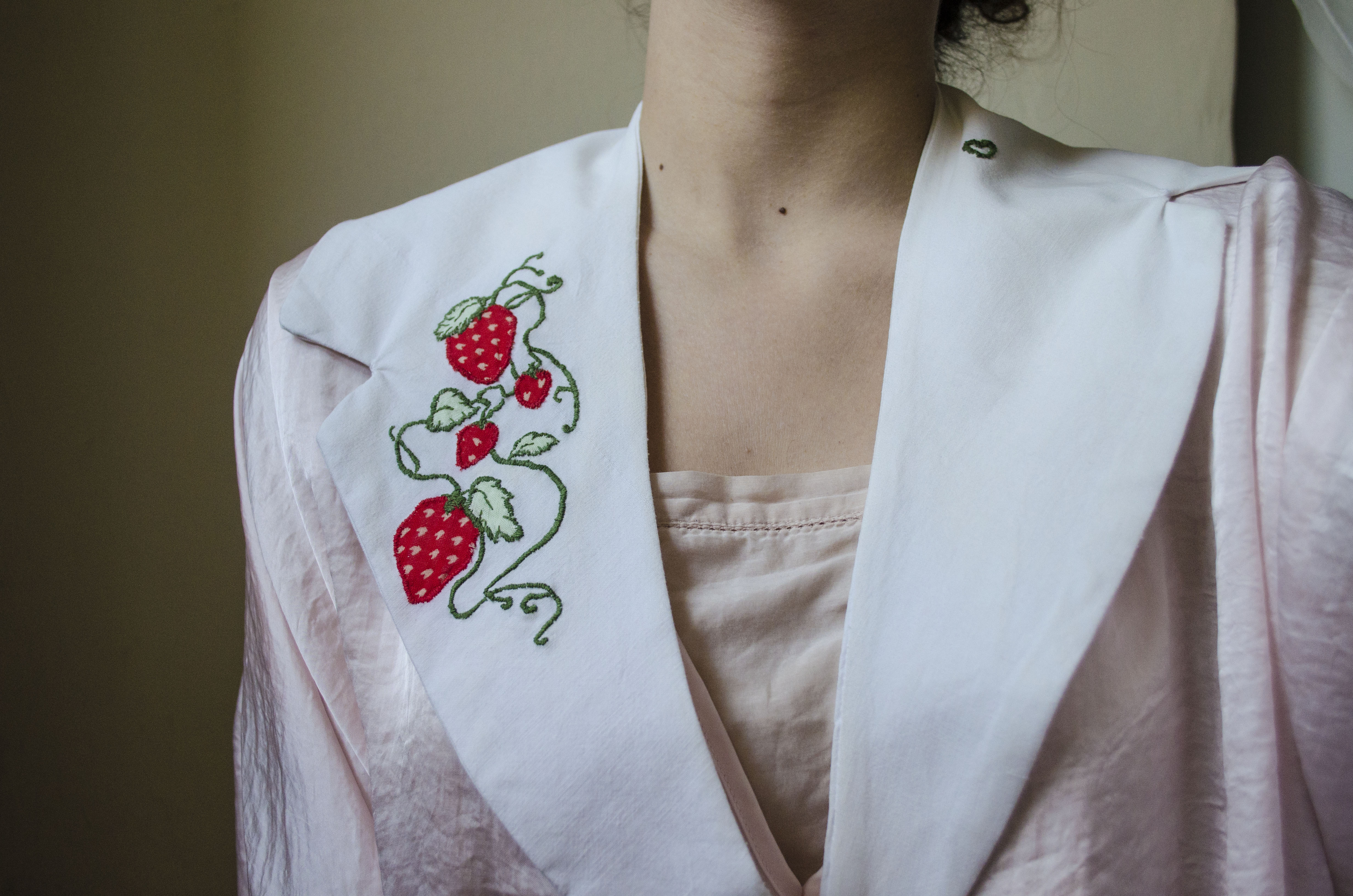 v neck line collar, handmade with lovely strawberries embroidery on the right side and a a cute little heart on the left.