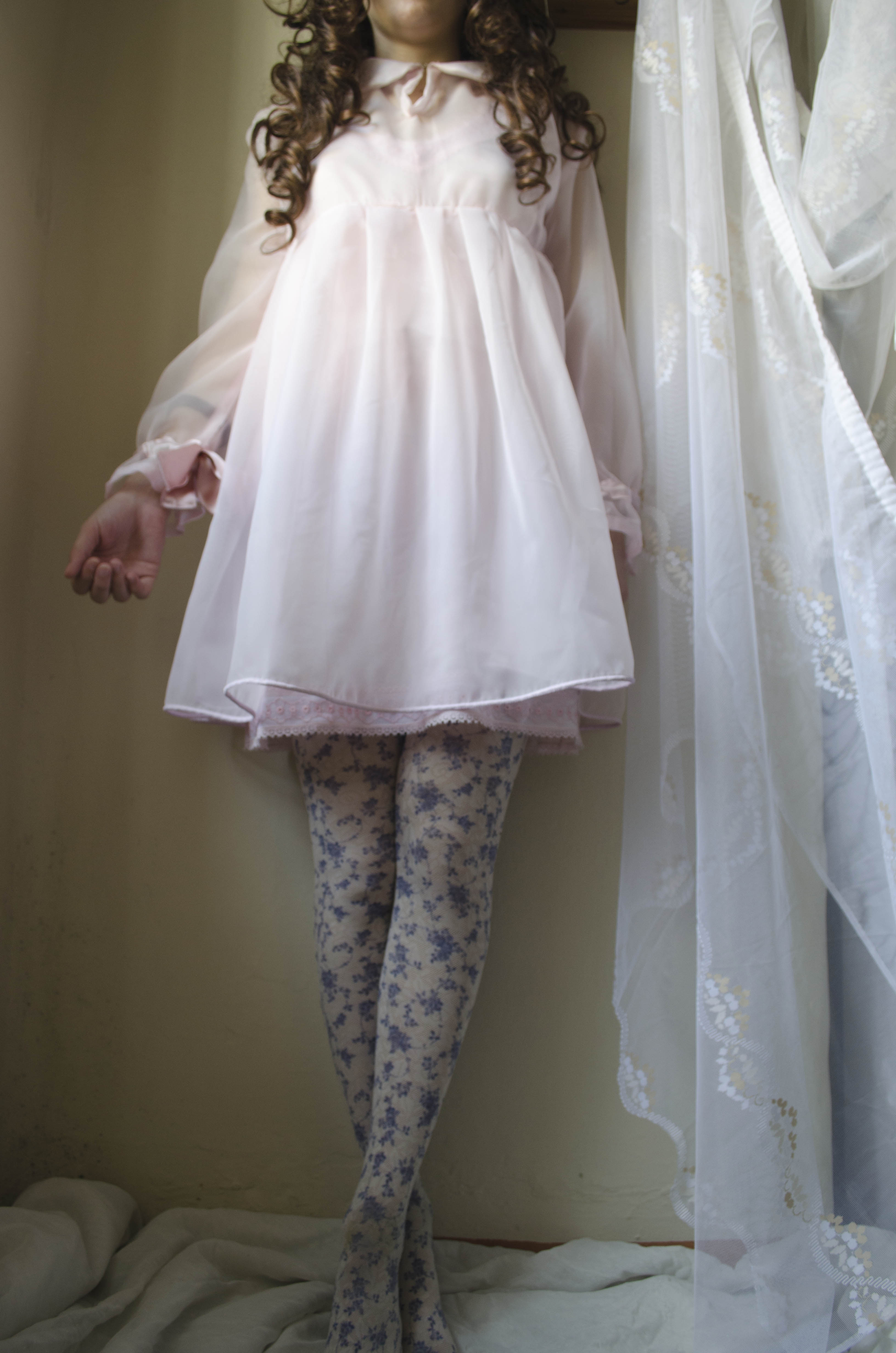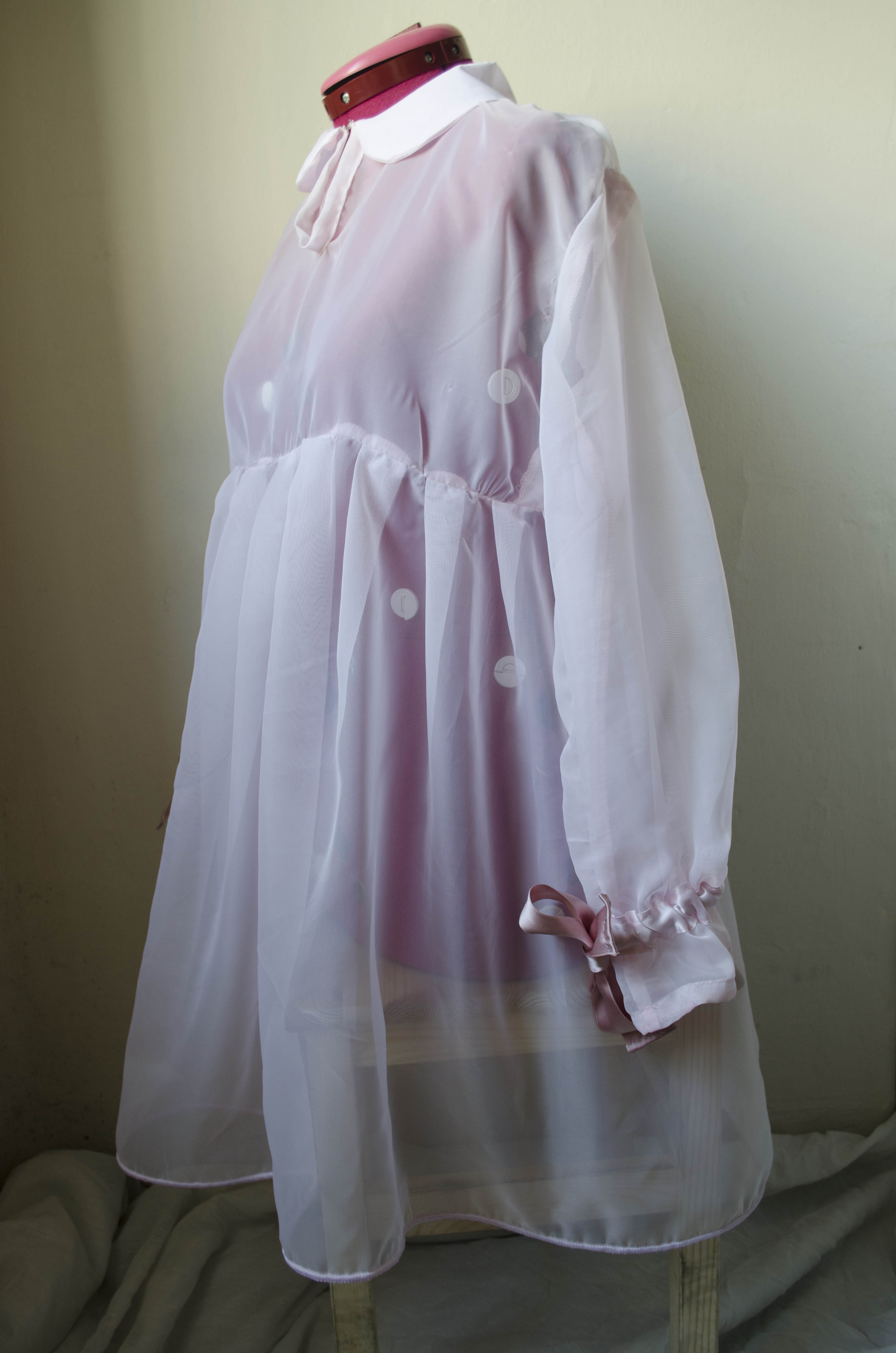 Baby ghost dress totally handmade, with details all handsewn, peter pan collar, side closing and cuffs with clip closure.