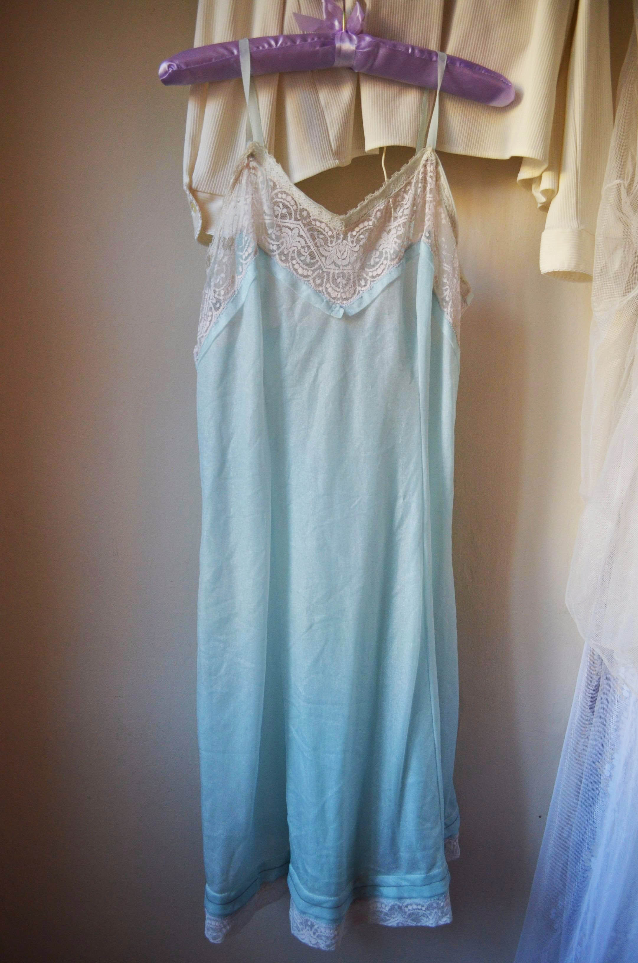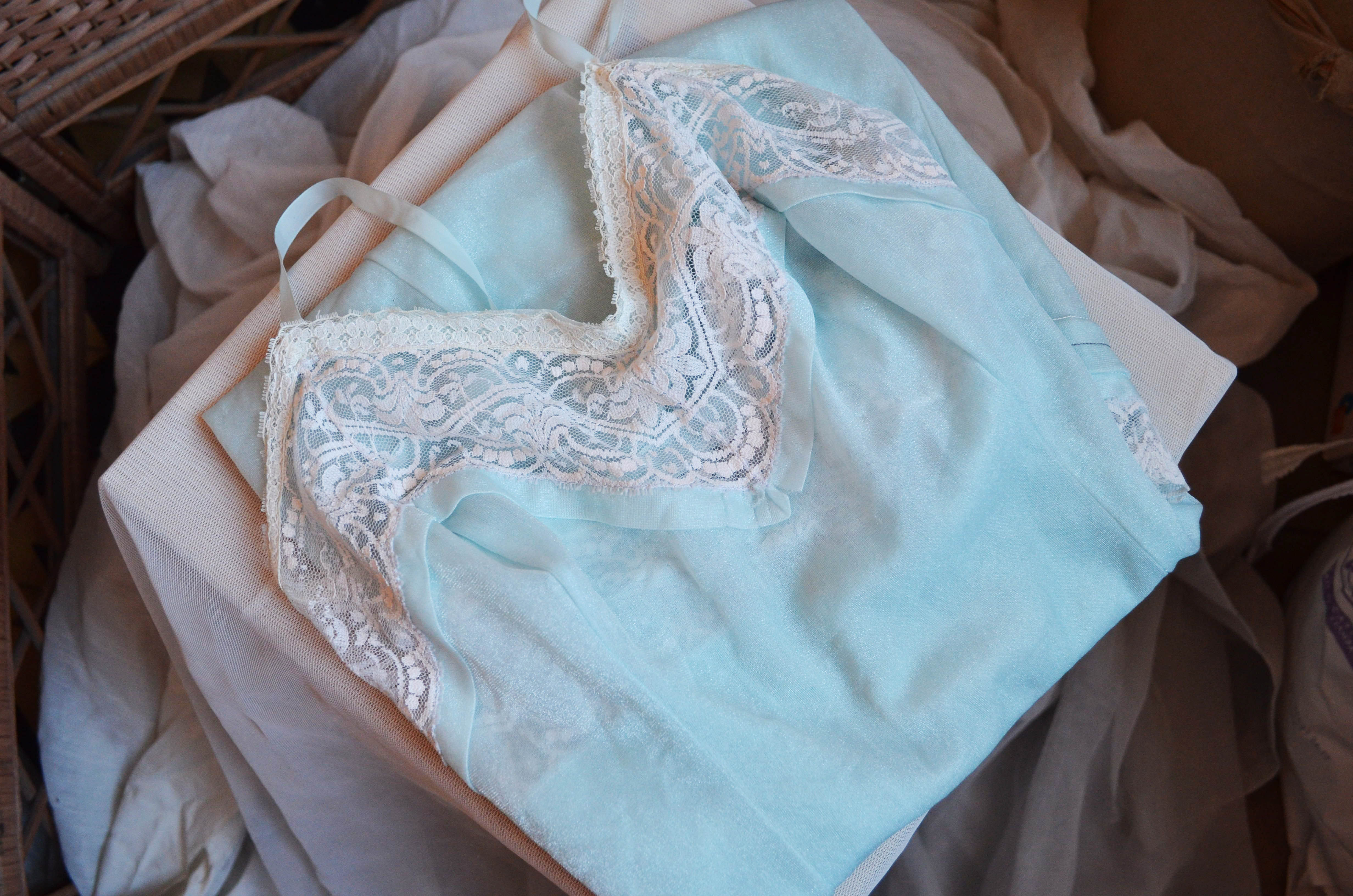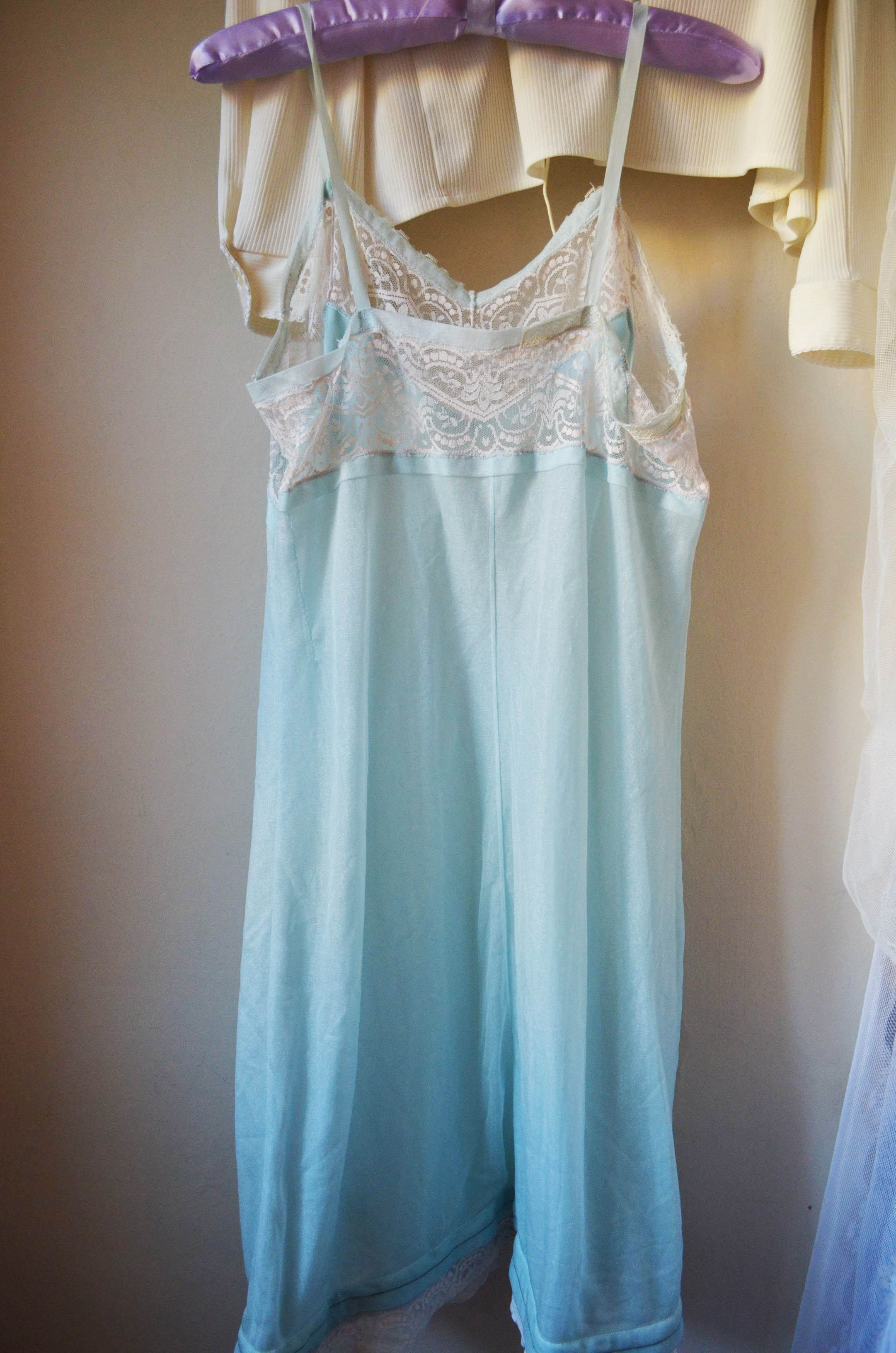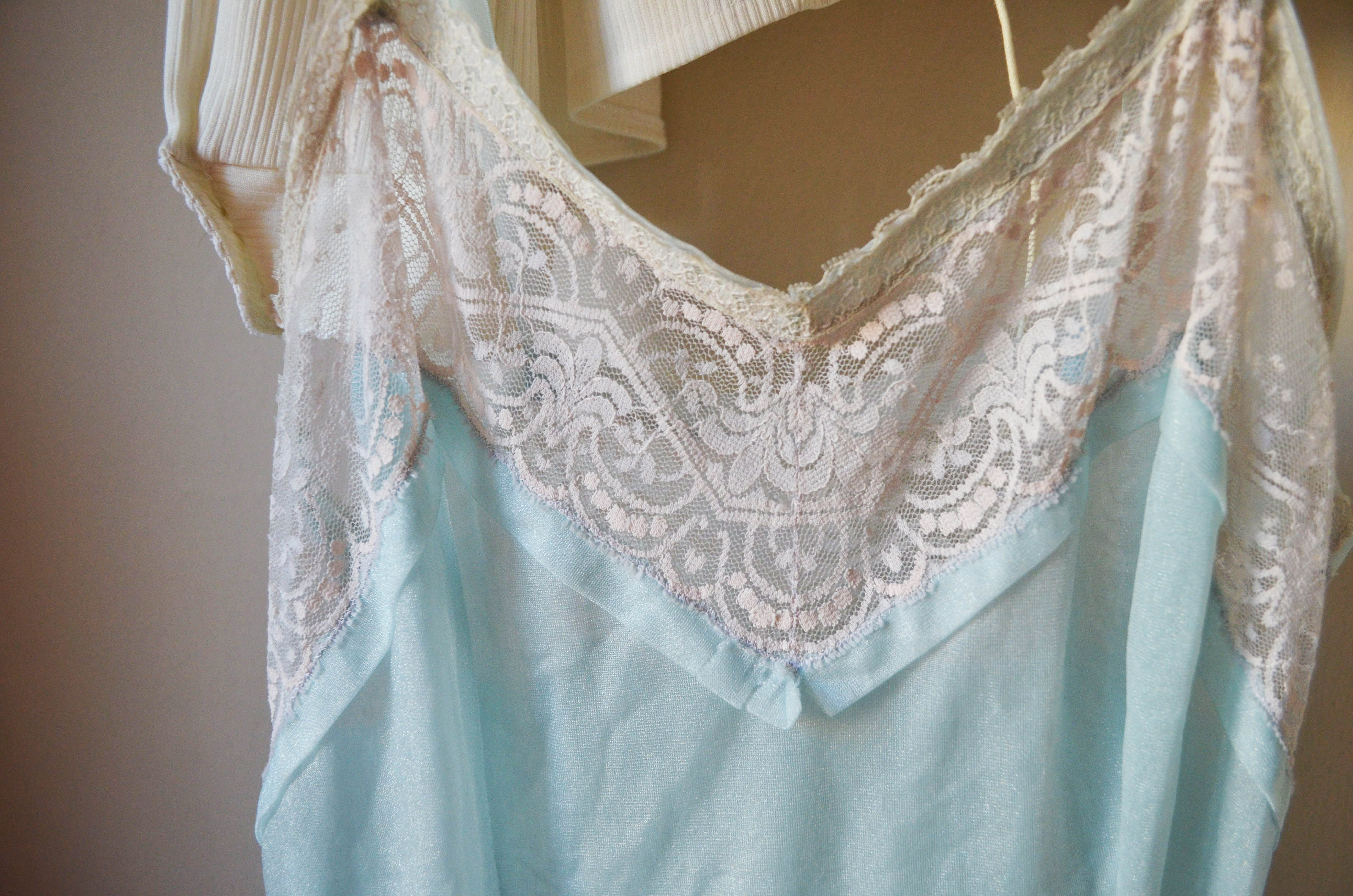 Vintage piece in this fabolous shining light blue with lace decoration on the top. All the part are original it has not be modified in any way